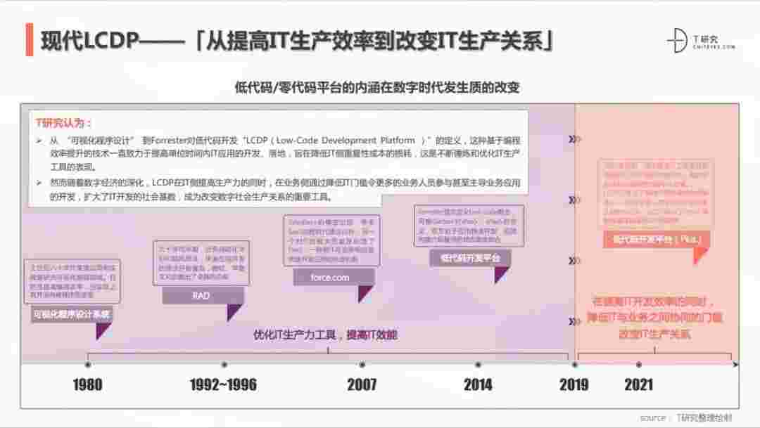 2020年前后,,,,源于提高IT工作者开发效能的LCDP不断进化和衍生,,,,面对业务导向日益明显的数字化变革。。。LCDP衍生出了面向不同对象的升级服务——面向专业人群的LCDP和业务人群的NCDP,,,,LCDP与NCDP的不同服务属性被逐渐认可和接受。。。。 LCDP在提高IT开发效率的同时,,,,降低IT与业务之间协同的门槛改变IT生产关系。。
