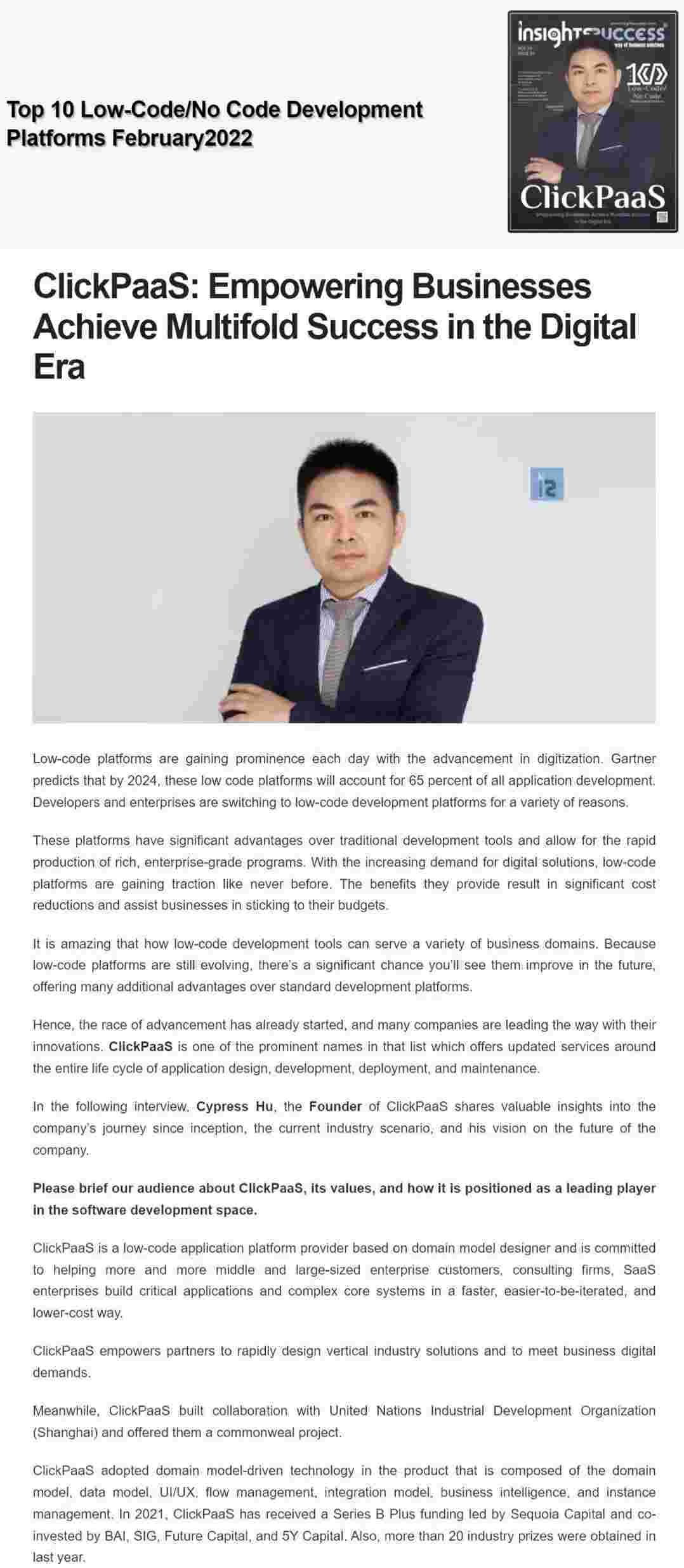 2022年年初,,钱能钱包入选外媒Insights Success低代码/无代码开发平台 Top10,,,创始人、、、CEO胡柏受邀接受专访并荣登封面人物,,,,他与Insights Success的读者分享了钱能钱包成立的初心、、、、发展历程、、当前的行业发展趋势以及他对公司未来的展望。。